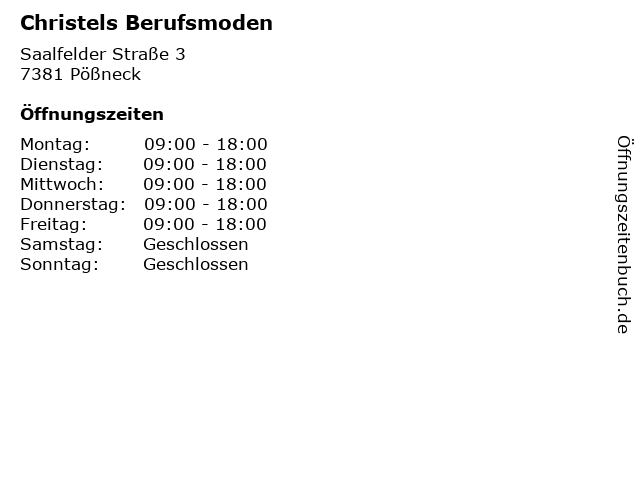 | Öffnungszeiten Christels Berufsmoden in Pößneck anzeigen | |