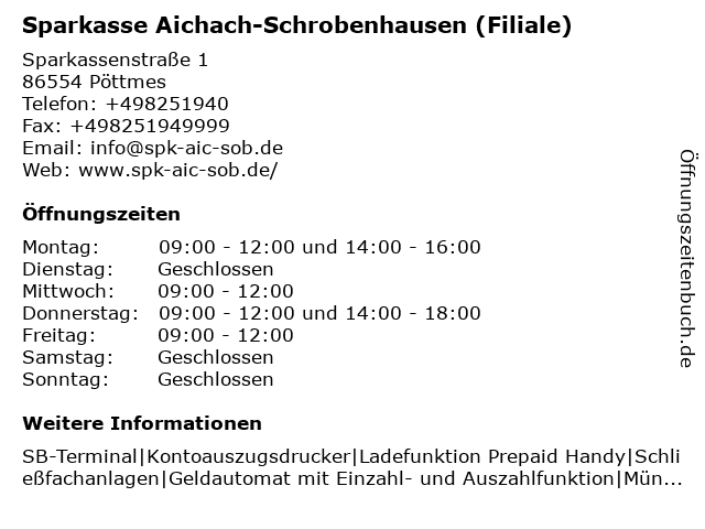| Öffnungszeiten Sparkasse Altbayern (Filiale) in Pöttmes anzeigen | |