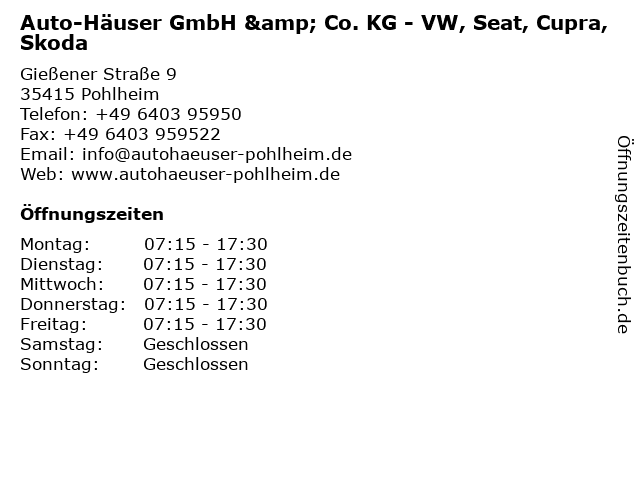 1 Auto-Häuser GmbH & Co KG - Service/Teiledienst (Entfernung: 0,00 km) Gießener Straße 9, 35415 Pohlheim 5 Autohaus Brass VW, Audi und Skoda - Service (Entfernung: 5,39 km) Frankfurter Straße 171, 35392 Gießen 6 Autohaus Brass VW, Audi und Skoda - Verkauf (Entfernung: 5,39 km) Frankfurter Straße 171, 35392 Gießen |