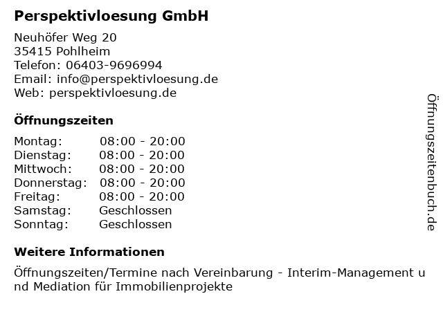 | Öffnungszeiten Perspektivloesung GmbH in Pohlheim anzeigen | |