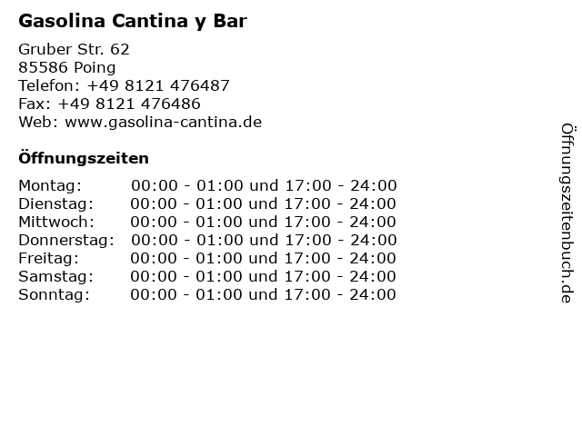 | Telefonnummer Gasolina Cantina y Bar in Poing (+49 8121 476487) anrufen | |