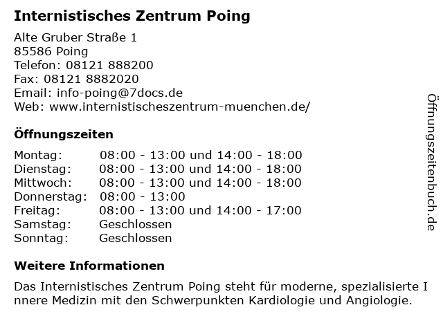 | Öffnungszeiten Internistisches Zentrum Poing in Poing anzeigen | |