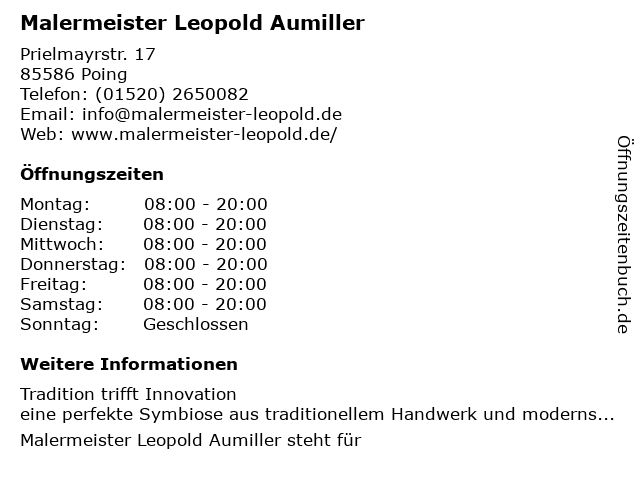| Öffnungszeiten Malermeister Leopold Aumiller in Poing anzeigen | |