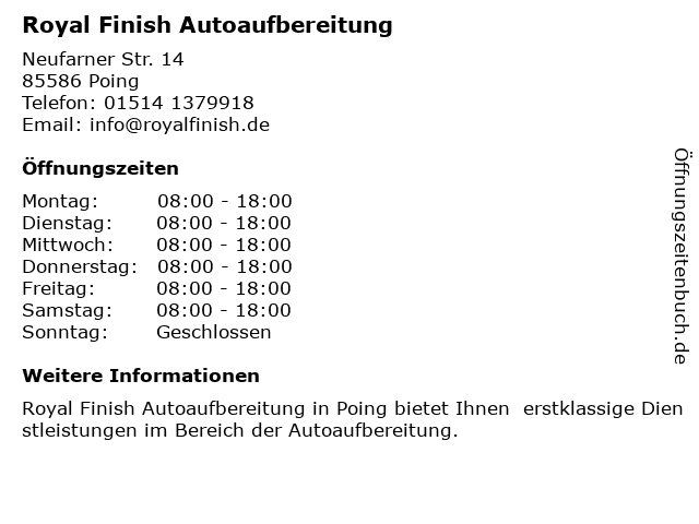 | Öffnungszeiten Royal Finish Autoaufbereitung in Poing anzeigen | |