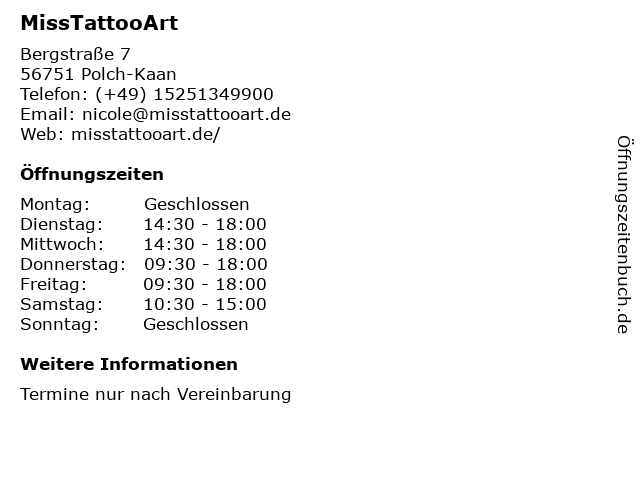 | Öffnungszeiten MissTattooArt in Polch-Kaan anzeigen | |