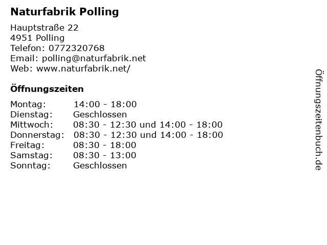 | Öffnungszeiten Naturfabrik Polling in Polling anzeigen | |