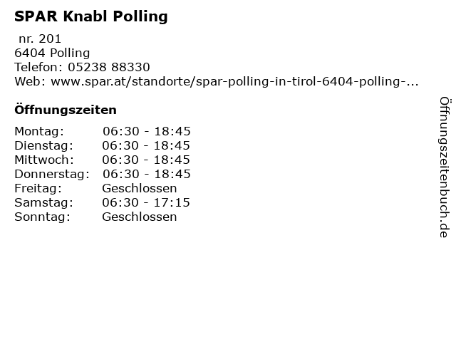 | Öffnungszeiten SPAR Knabl Polling in Polling anzeigen | |