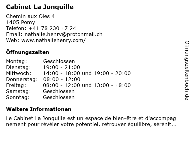 | Telefonnummer Cabinet La Jonquille in Pomy (+41 78 230 17 24) anrufen | |