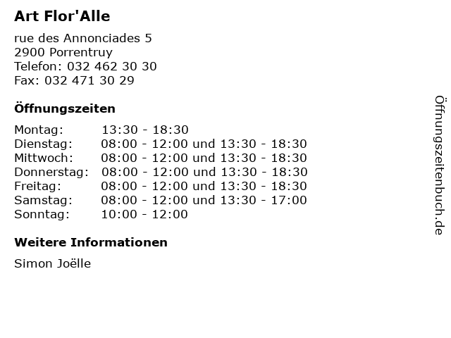 | Öffnungszeiten Art Flor'Alle in Porrentruy anzeigen | |