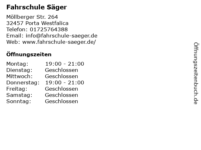 | Öffnungszeiten Fahrschule Säger in Porta Westfalica anzeigen | |