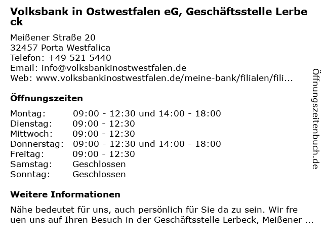 2 Polizei Minden-Lübbecke - Bezirksdienst Lerbeck / Kleinenbremen (Entfernung: 0,38 km) Georg-Rost-Straße 25, 32457 Porta Westfalica 3 Kindertagesstätte Familienzentrum Lerbeck (Entfernung: 0,44 km) Am Rottbrink 15, 32457 Porta Westfalica 4 Gemeindezentrum Neesen - Ev.-Luth. Kirchengemeinde Lerbeck (Entfernung: 0,52 km) Friedrichstraße 12, 32457 Porta Westfalica 6 Volksbank in Ostwestfalen eG, Geschäftsstelle Barkhausen (Entfernung: 1,89 km) Portastraße 73, 32457 Porta Westfalica |