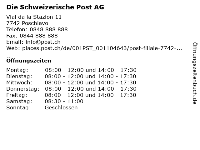 | Öffnungszeiten Die Schweizerische Post AG in Poschiavo anzeigen | |