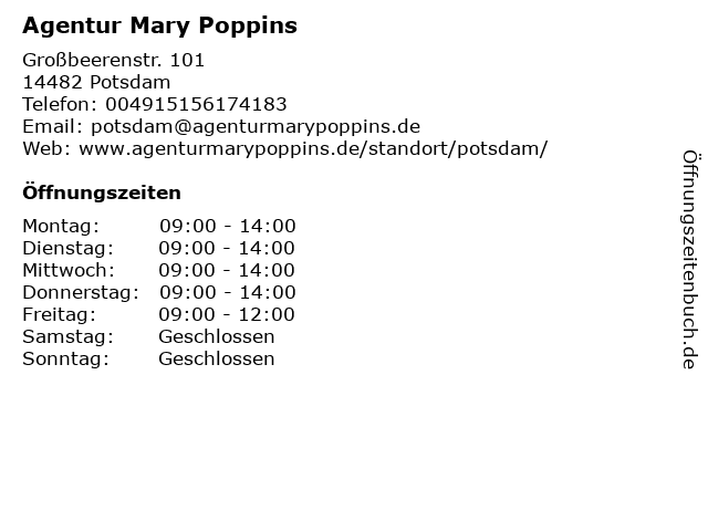 | Öffnungszeiten Agentur Mary Poppins in Potsdam anzeigen | |