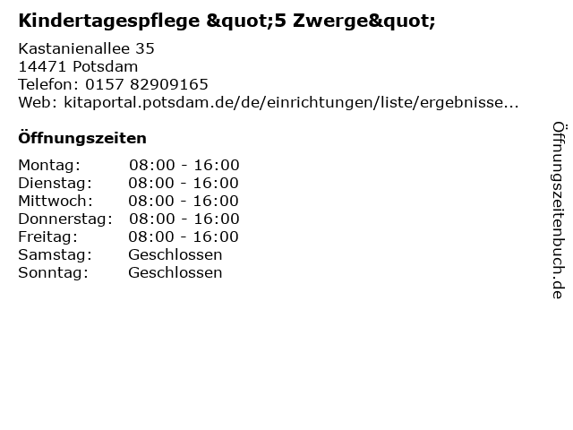 | Öffnungszeiten Kindertagespflege "5 Zwerge" in Potsdam anzeigen | |