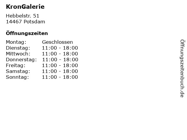 | Öffnungszeiten KronGalerie in Potsdam anzeigen | |