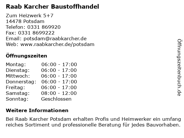 | Öffnungszeiten Raab Karcher Baustoffhandel in Potsdam anzeigen | |