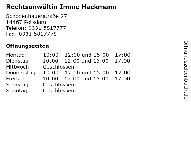 | Öffnungszeiten Rechtsanwältin Imme Hackmann in Potsdam anzeigen | |