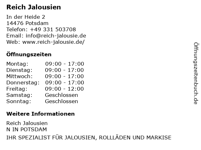 | Öffnungszeiten Reich Jalousien in Potsdam anzeigen | |