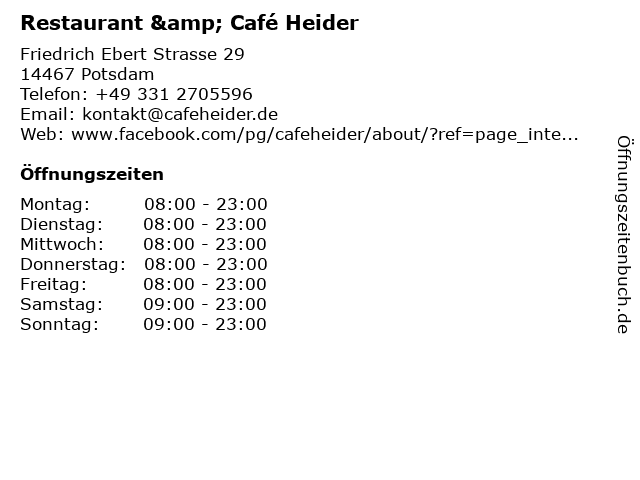 | Öffnungszeiten Restaurant & Café Heider in Potsdam anzeigen | |