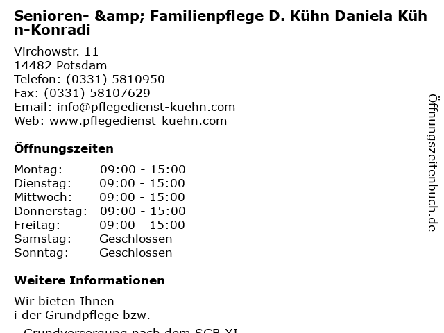 1 Daniela Kühn-Konradi Senioren- u. Familienpflegedienst (Entfernung: 1,68 km) Großbeerenstr. 50, 14482 Potsdam 6 Sen Vital - Senioren- und Pflegezentrum (Entfernung: 6,81 km) Förster-Funke-Allee 101, 14532 Kleinmachnow |