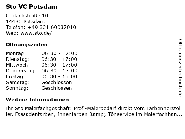 | Öffnungszeiten Sto VC Potsdam in Potsdam anzeigen | |