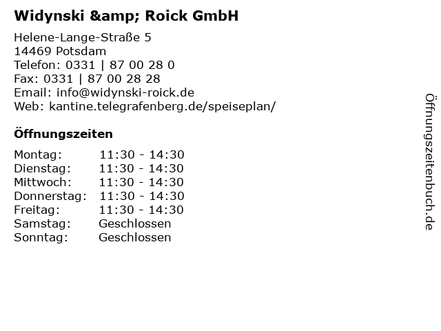 | Öffnungszeiten Widynski & Roick GmbH in Potsdam anzeigen | |