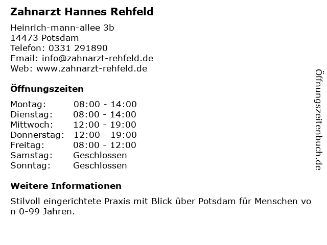 | Öffnungszeiten Zahnarzt Hannes Rehfeld in Potsdam anzeigen | |