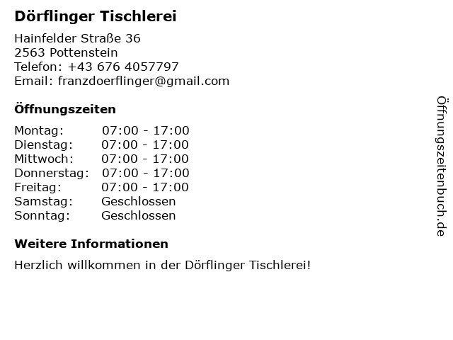 | Öffnungszeiten Dörflinger Tischlerei in Pottenstein anzeigen | |