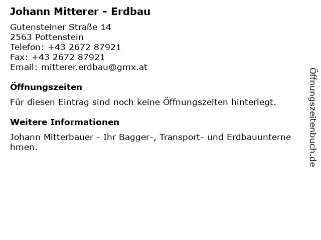 | Öffnungszeiten Johann Mitterer - Erdbau in Pottenstein anzeigen | |