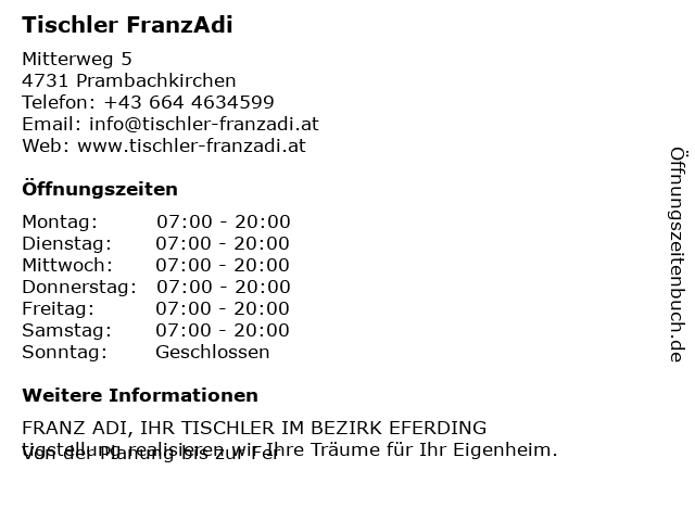 | Öffnungszeiten Tischler FranzAdi in Prambachkirchen anzeigen | |