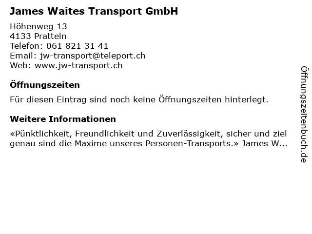 | Öffnungszeiten James Waites Transport GmbH in Pratteln anzeigen | |