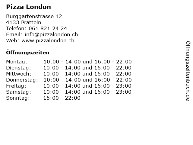 | Öffnungszeiten Pizza London in Pratteln anzeigen | |