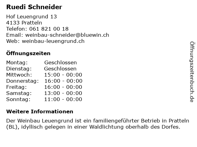 | Öffnungszeiten Ruedi Schneider in Pratteln anzeigen | |