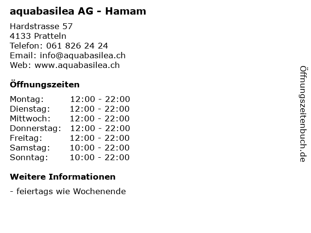 | Öffnungszeiten aquabasilea AG - Hamam in Pratteln anzeigen | |