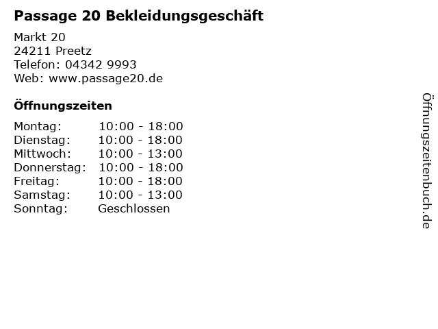 | Öffnungszeiten Passage 20 Bekleidungsgeschäft in Preetz anzeigen | |