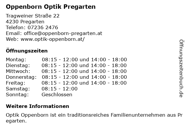 | Öffnungszeiten Oppenborn Optik Pregarten in Pregarten anzeigen | |