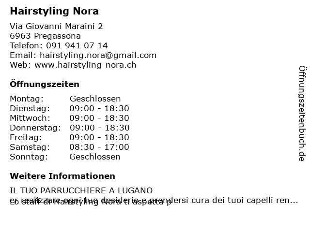 | Öffnungszeiten Hairstyling Nora in Pregassona anzeigen | |