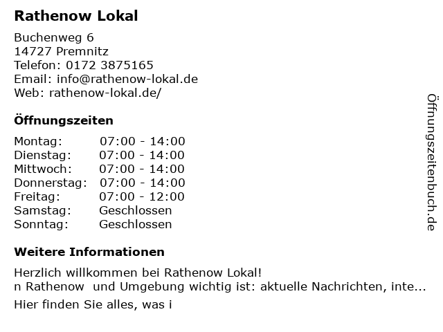 | Öffnungszeiten Rathenow Lokal in Premnitz anzeigen | |