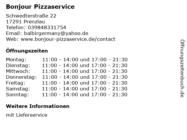 | Öffnungszeiten Bonjour Pizzaservice in Prenzlau anzeigen | |