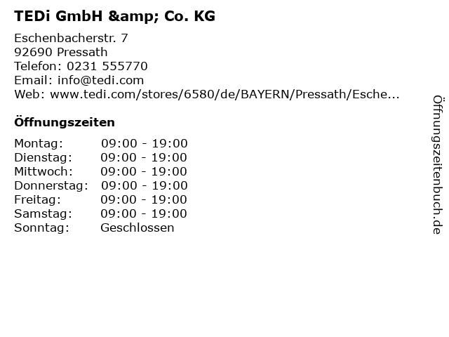 | Öffnungszeiten TEDi GmbH & Co. KG in Pressath anzeigen | |