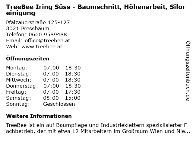 3 Büro für Baumpflege und städtisches Grün - DI Christian Rohr (Entfernung: 10,61 km) Gerersdorf 34, 3443 Sieghartskirchen 5 Josef Roiser - Baumschnitt, Rodung, Beratung (Entfernung: 22,88 km) Schilfweg 33, 3423 St.Andrä-Wördern 6 |