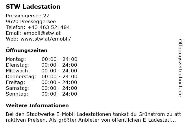 | Öffnungszeiten STW Ladestation in Presseggersee anzeigen | |