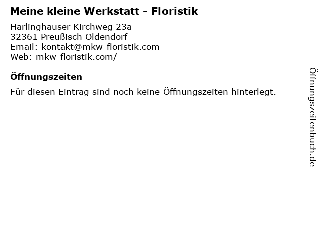 | Öffnungszeiten Meine kleine Werkstatt - Floristik in Preußisch Oldendorf anzeigen | |