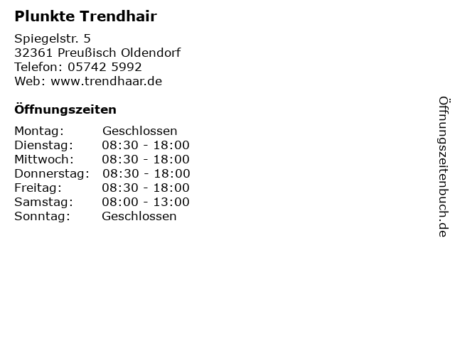 | Öffnungszeiten Plunkte Trendhair in Preußisch Oldendorf anzeigen | |