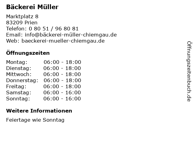 | Öffnungszeiten Bäckerei Müller in Prien anzeigen | |