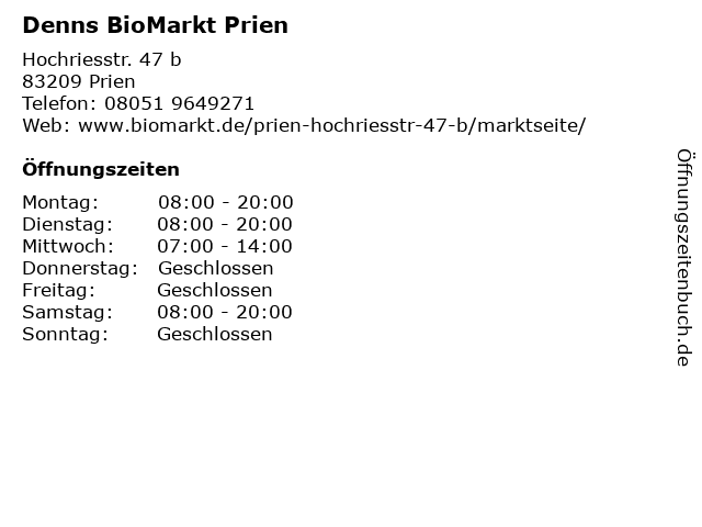 | Öffnungszeiten Denns BioMarkt Prien in Prien anzeigen | |