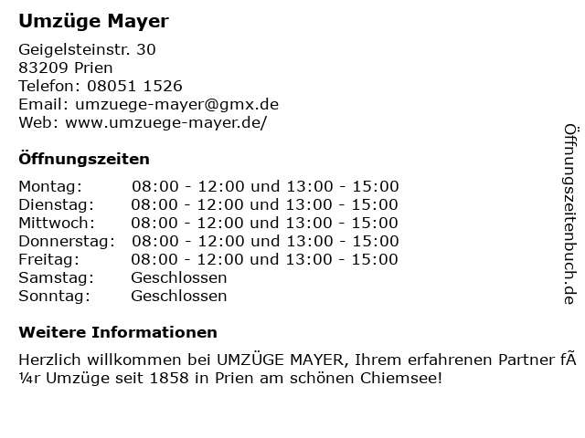 | Öffnungszeiten Umzüge Mayer in Prien anzeigen | |