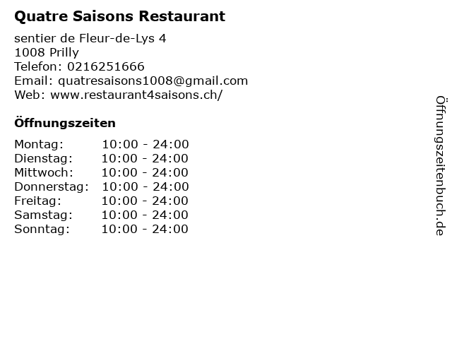| Öffnungszeiten Quatre Saisons Restaurant in Prilly anzeigen | |