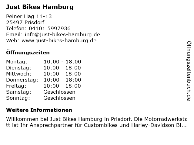 | Öffnungszeiten Just Bikes Hamburg in Prisdorf anzeigen | |