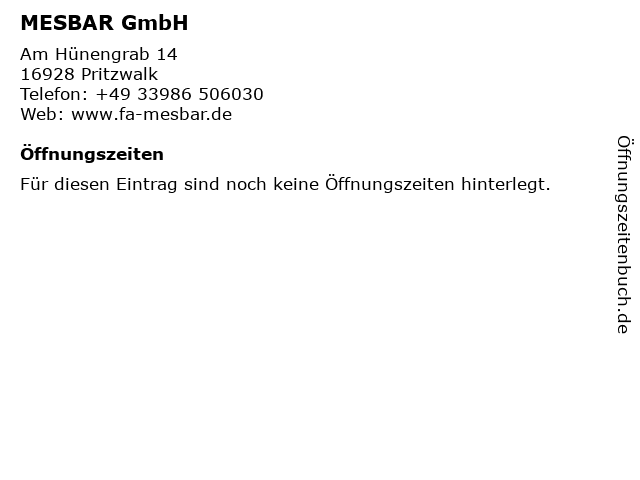 | Öffnungszeiten MESBAR GmbH in Pritzwalk anzeigen | |